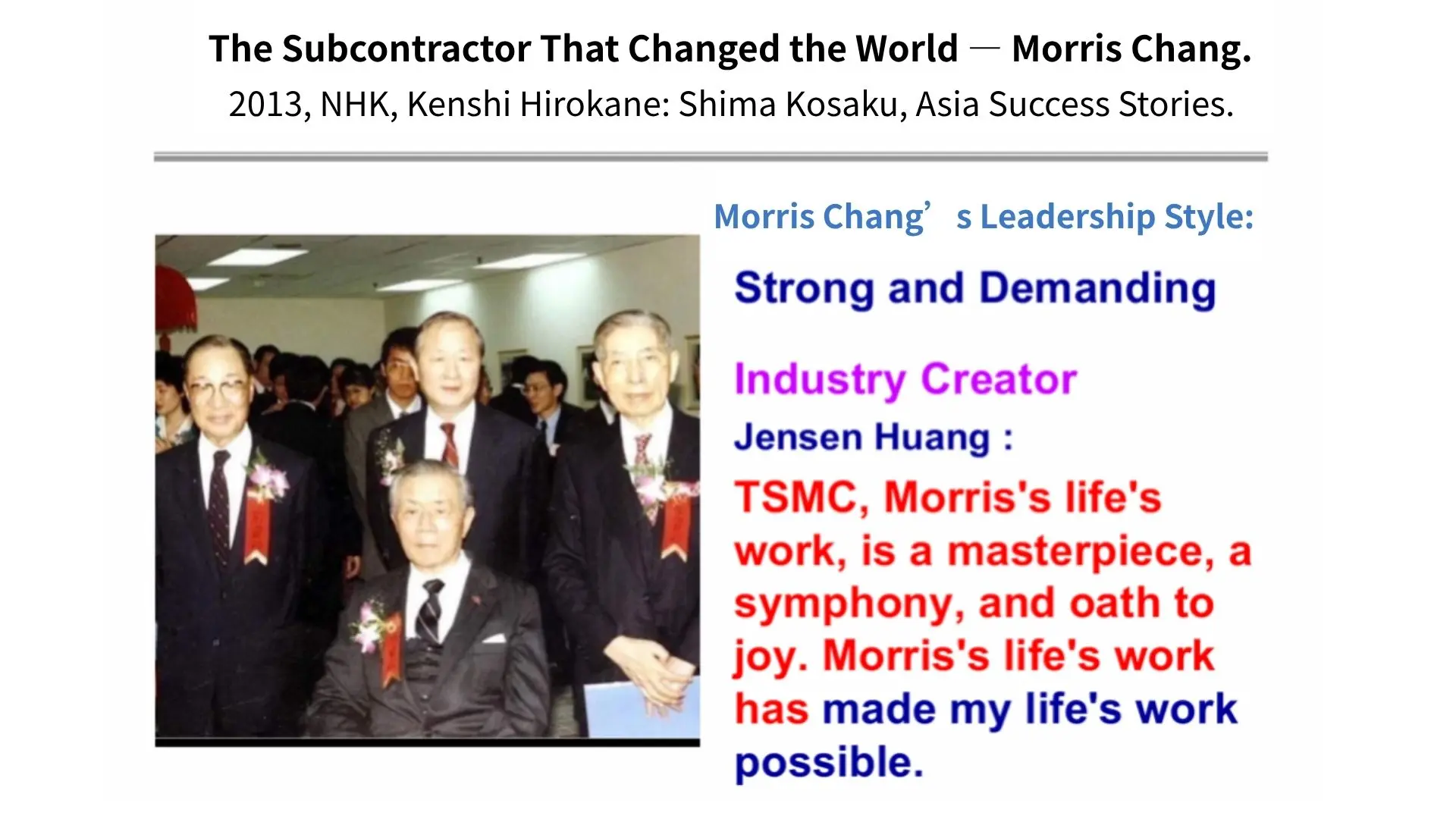 陳氏によれば、TSMCにおけるモリス・チャンの役割は段階的に進化していったという。1987年の設立当時、彼はまだ台湾半導体産業の揺りかごである工業技術研究院(ITRI)のトップを兼任しており、TSMCの専任ではなかった。そのため最初の10年間、経営権は3人の米国人社長に委ねられていた。当時の一般社員から見たモリス・チャンは、非常に厳格で近寄りがたい存在であり、上級幹部としか交流していなかったという。