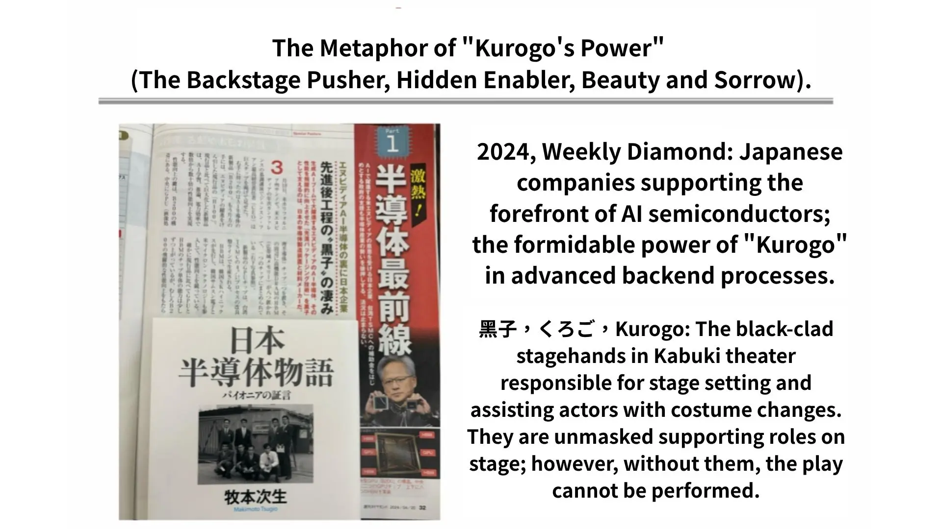 『半導体戦争』の著者クリス・ミラー氏はかつて、TSMCの最も決定的な経済的な堀(参入障壁)は「Embedding(組み込み)」と「Symbiosis(共生)」にあると分析した。TSMCは自らを世界のサプライチェーンの奥深くに組み込み、不可欠な一部となった。NVIDIA(エヌビディア)のジェンスン・フアンCEOは台湾を「声なき英雄(The unsung hero)」と称賛し、日本の『週刊ダイヤモンド』は2024年、TSMCを歌舞伎における「黒衣(くろご)」に例えた。舞台上では顔を見せず、衣装替えや舞台装置の転換を助ける黒づくめの裏方だが、彼らがいなければ芝居は成り立たない。(図参照)
