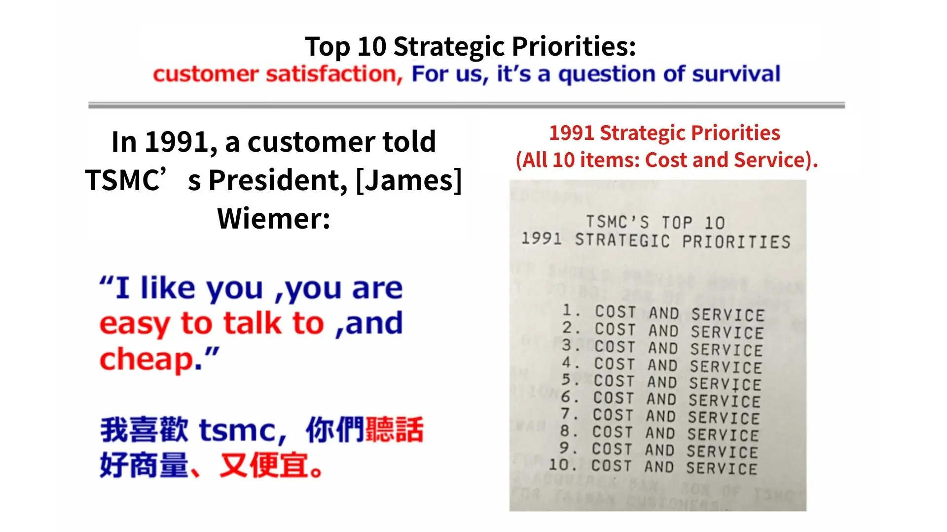 したがって、TSMCの主要戦略について問われた際、陳氏は「実は最初の10年間、TSMCのトップ10戦略は『Cost and Service(コストとサービス)』だった」と語った。これは冗談ではなく、彼は講演会場で当時撮影した写真を実際に提示した。オフィスの壁に掲げられたトップ10戦略には、10項目すべてに全く同じ「Cost and Service」という言葉が書かれていたのである。(図2参照)