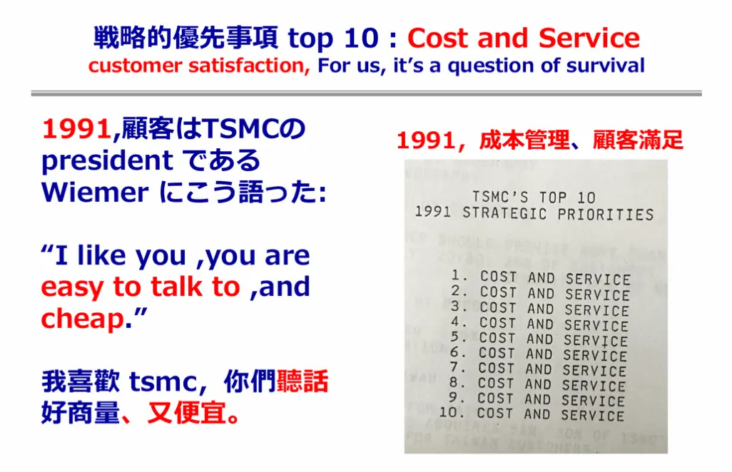 台積電最初前十年的三位總經理都是美籍人士。當時有一位外籍總經理曾說,有一位客戶跟他說:「I like you, you are easy to talk to, and cheap.」也就是說,早期的台積電在客戶眼中,是一個聽話、好商量,又便宜的代工夥伴。