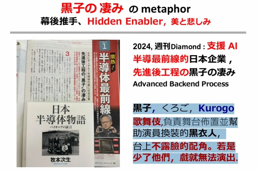 《晶片戰爭》作者 Chris Miller 曾分析,台積電最關鍵的護城河在於 Embedding(嵌入)與 Symbiosis(共生)。台積電將自己深嵌於全球供應鏈中,成為不可或缺的一部分。輝達(NVIDIA)執行長黃仁勳稱台灣為「不發聲的英雄(The unsung hero)」;日本《鑽石週刊》在 2024 年更將台積電比喻為歌舞伎中的「黑子(Kurogo)」——在台上不露臉、幫忙換裝佈景的黑衣人,但若少了他們,整齣戲就無法演下去。(見圖)